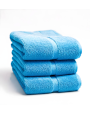 Esta toalla es una pieza de tela de color azul, que mide 70 x 40 centímetros. Está hecha de algodón 100%, con un gramaje de 400 gramos/m2. Tiene un tacto suave y esponjoso.