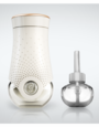 Este producto es un ambientador en aceite que incluye un aparato eléctrico y un repuesto. Tiene una fragancia relajante y dulce de lavanda y flor de durazno. El repuesto tiene un contenido de 21 ml.
