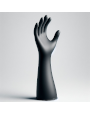 Este guante es de color negro, de 20 pulgadas de largo y de calibre 35. Está hecho de látex natural, sin talco y con un acabado satinado. Tiene un orillo de refuerzo en la manga y una forma anatómica y curva en los dedos. Es de talla 9, que corresponde a un tamaño grande.